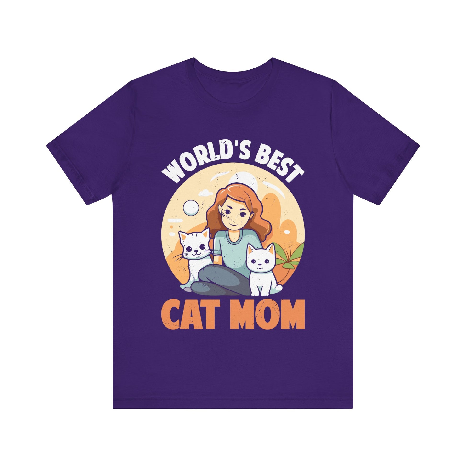 Celebrate the ultimate cat mama with this adorable “World’s Best Cat Mom” shirt, featuring a heartwarming illustration of a woman and her two beloved cats.