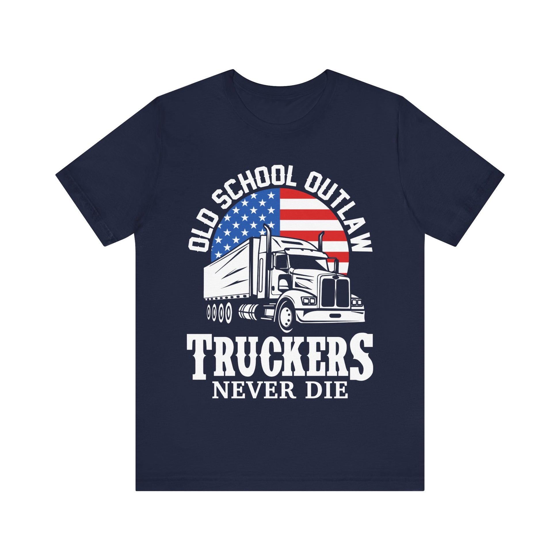 🚚 Powerful Trucker Design – “Outlaw Truckers Never Die” in red, white & blue with a bold semi-truck centerpiece
