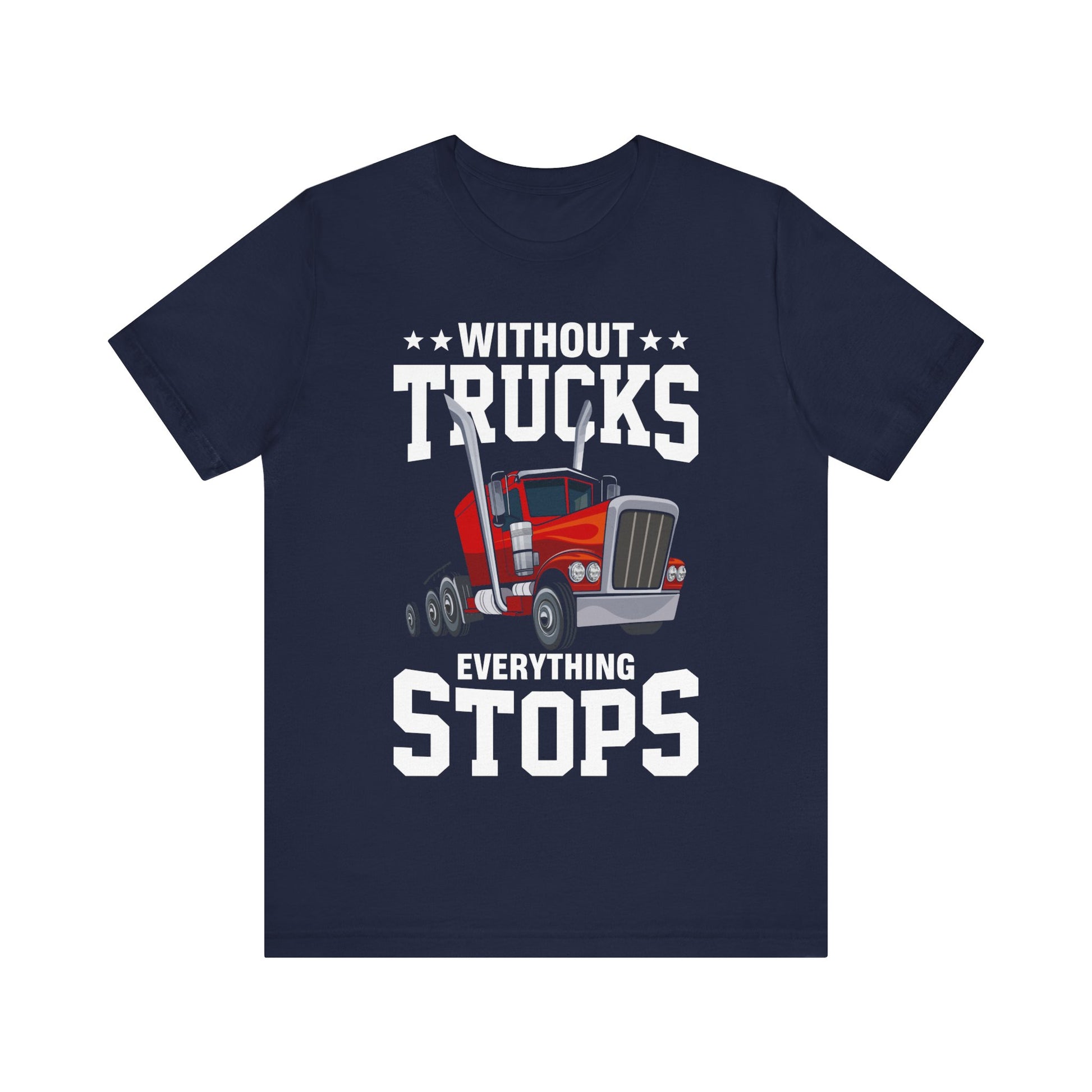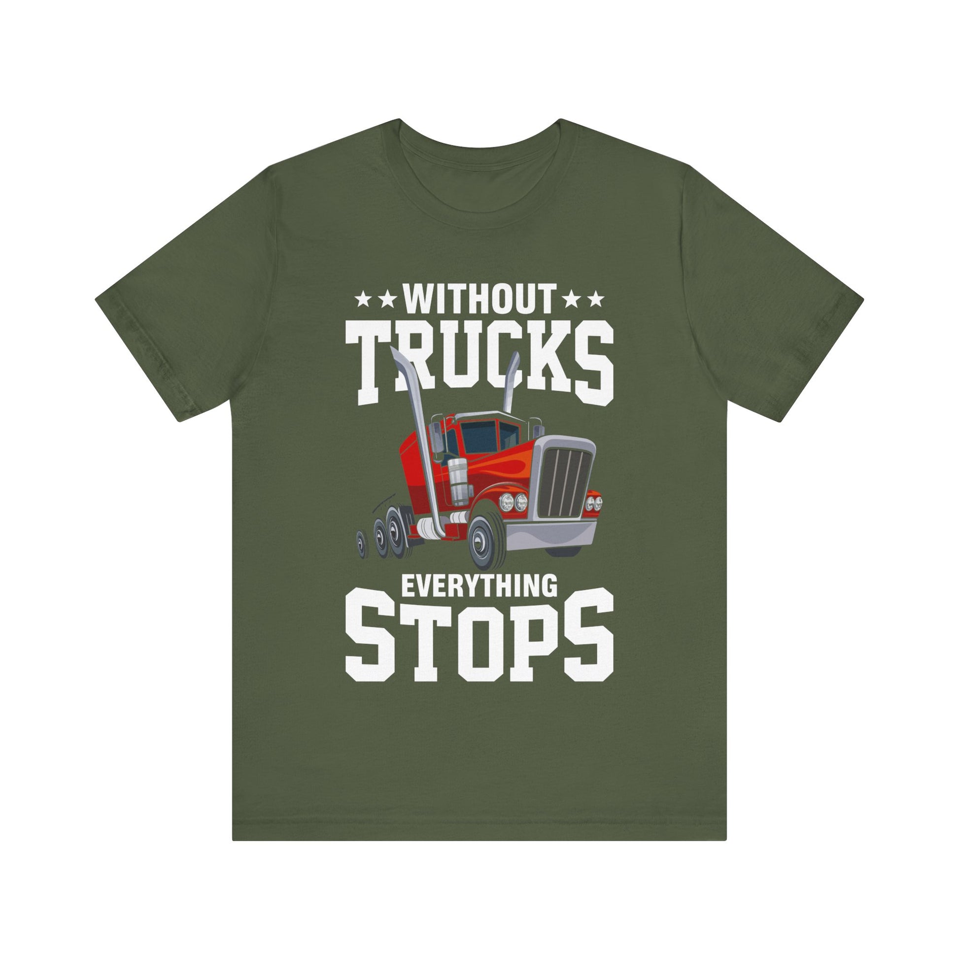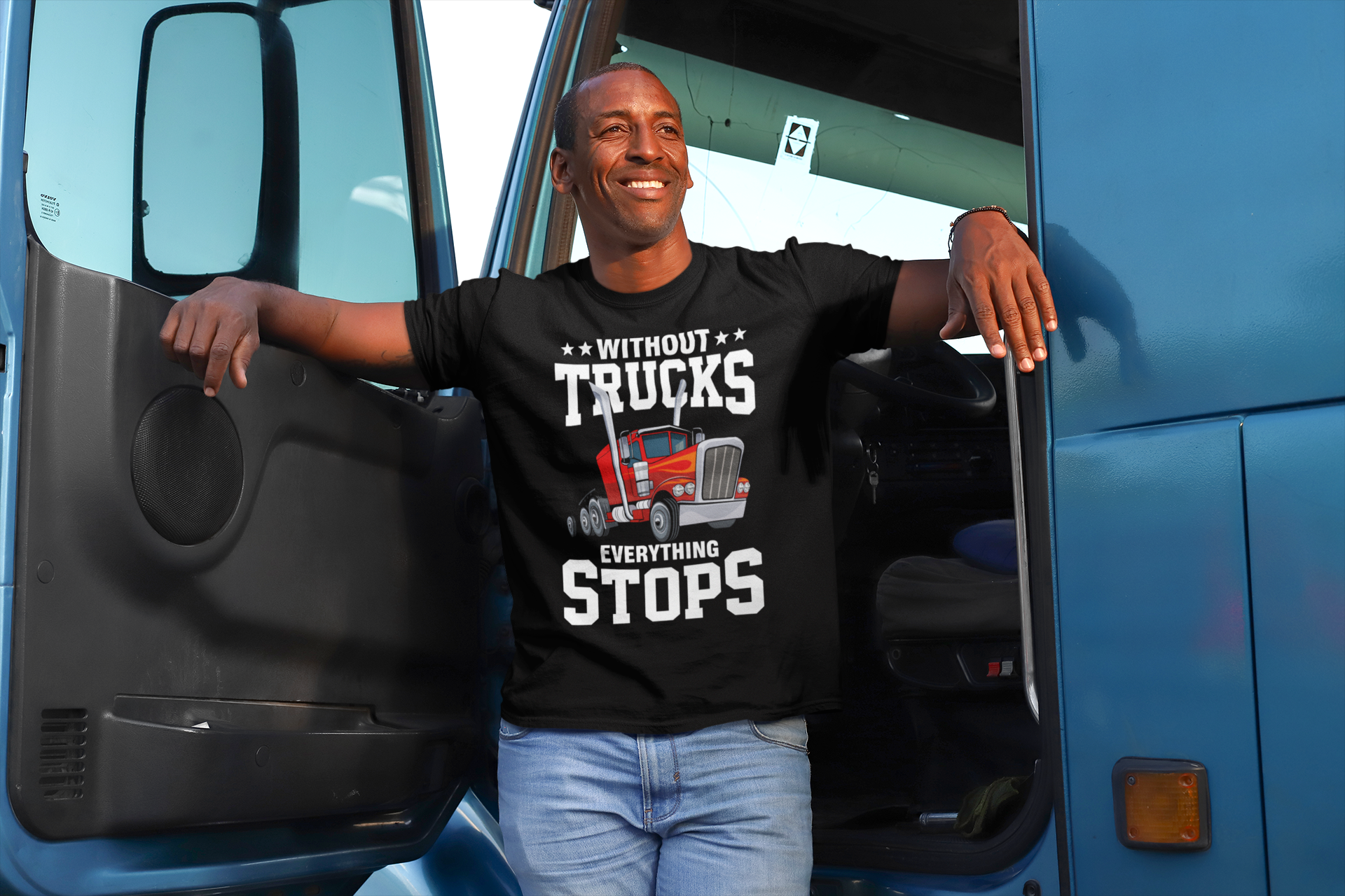 If you bought it, a truck brought it — and this shirt makes sure nobody forgets it. Featuring a bold cartoon-style red semi-truck and the powerful message “Without Truckers Everything Stops,” this graphic tee is for the real heroes of the highway.